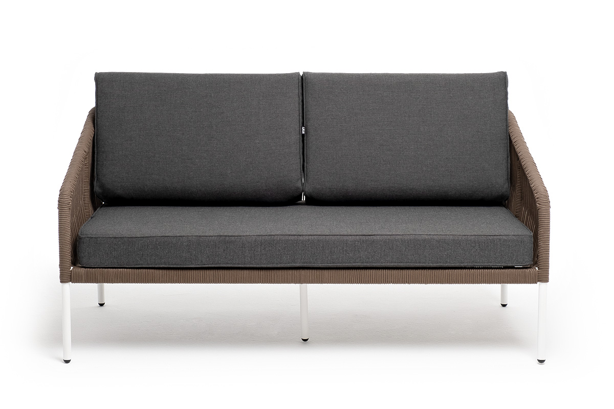 "Канны" диван 2-местный плетеный из роупа, каркас алюминий белый, роуп коричневый круглый, ткань серая