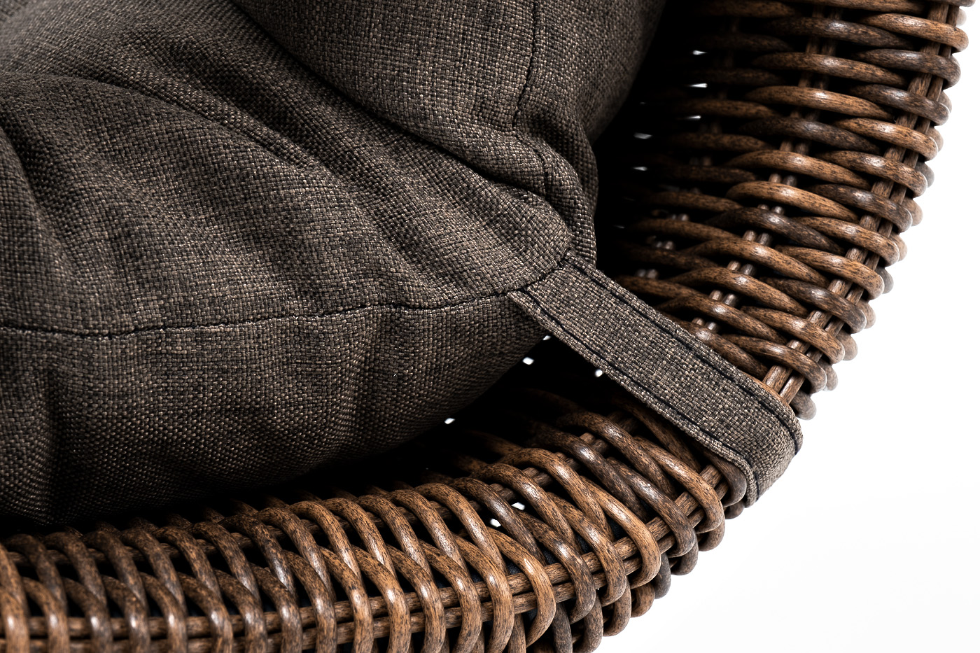 Садовое кресло дополнено мягкими подушками для комфортного размещения. Они выполнены в серо-коричневом цвете. При их пошиве используется полиэстер с плотностью 230гр/м2. Влагоотталкивающая пропитка усиливает защитные свойства материала.