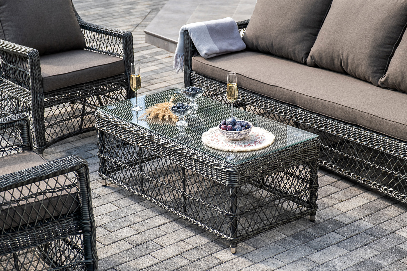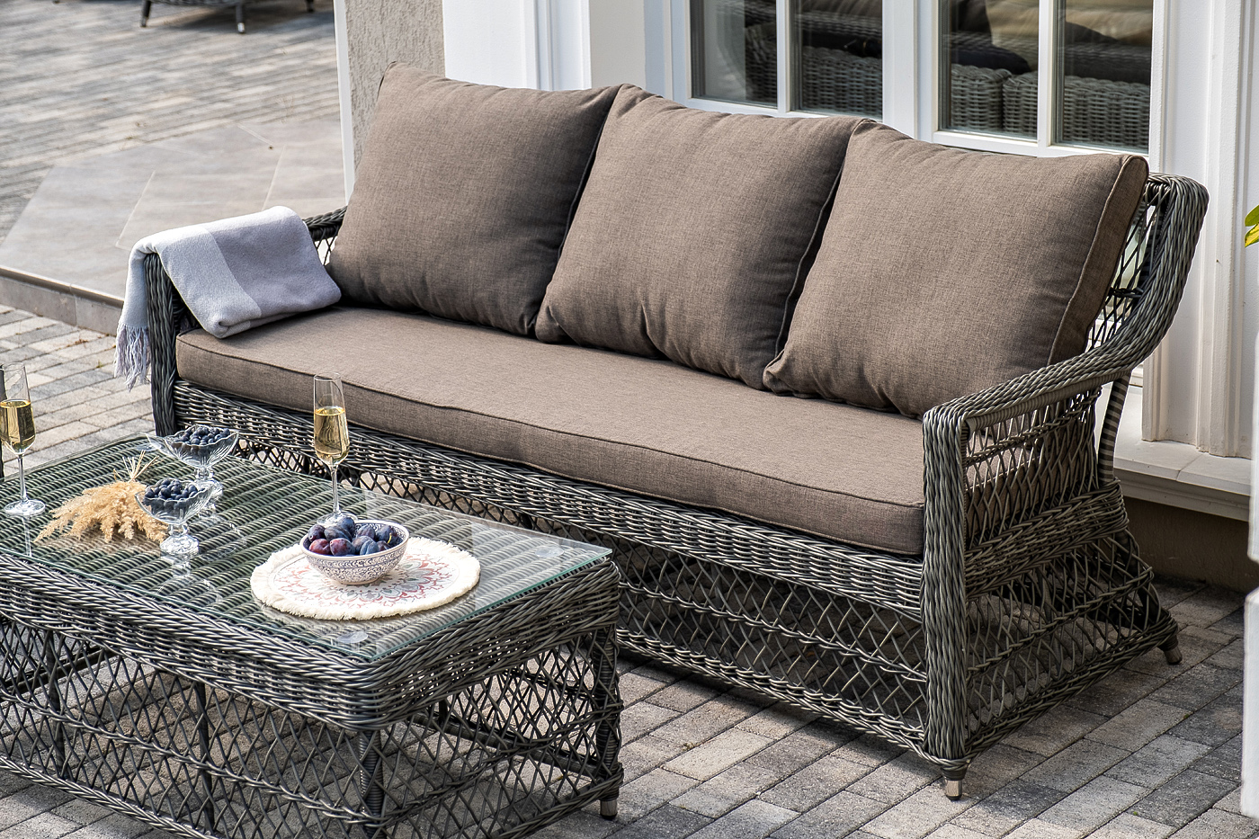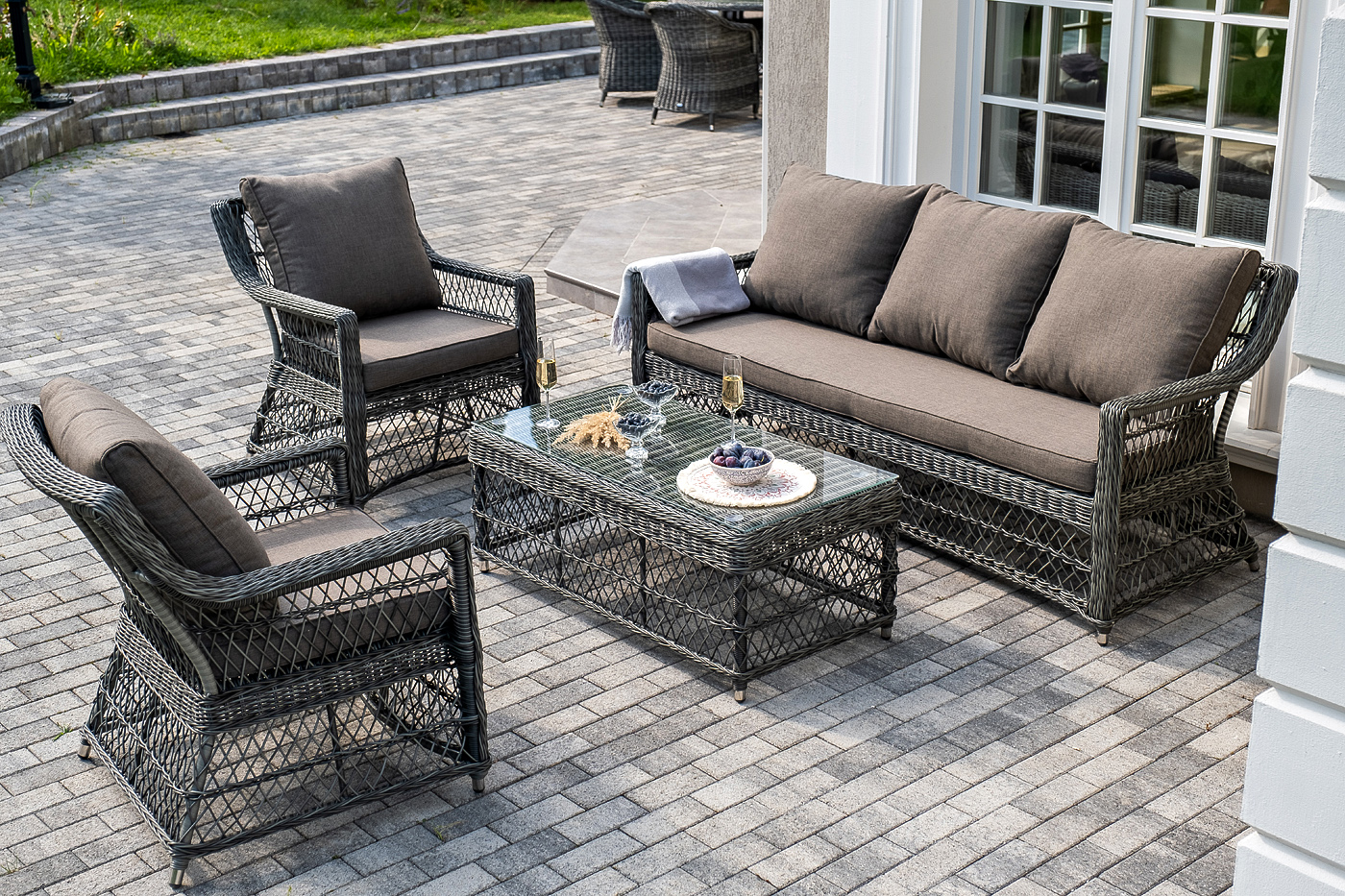 Уличная мебель имеет алюминиевый каркас с ручным плетением из искусственного ротанга в цвете "графит". Предусмотрены мягкие подушки из полиэстера серо-коричневого цвета с плотностью 230гр/м2. Они имеет влагоотталкивающую пропитку. Рабочая поверхность столика изготовлена из закаленного стекла толщиной 5 мм.