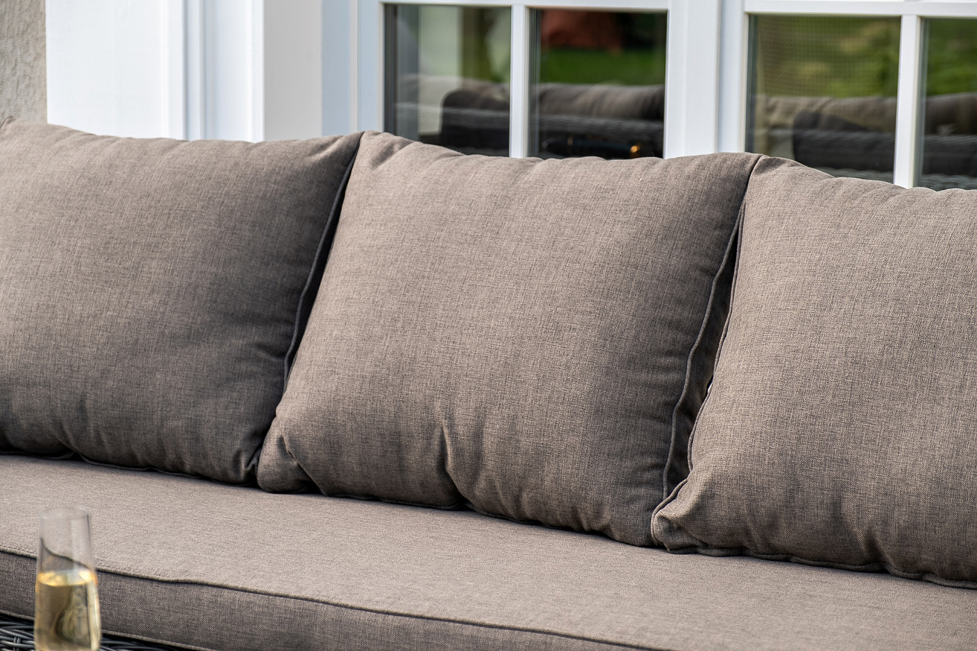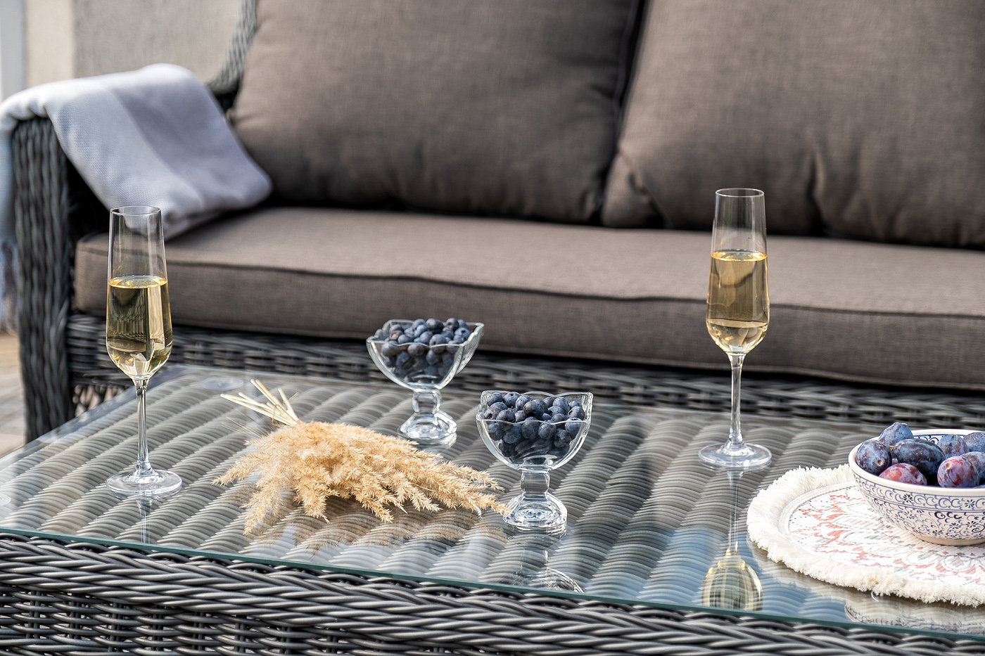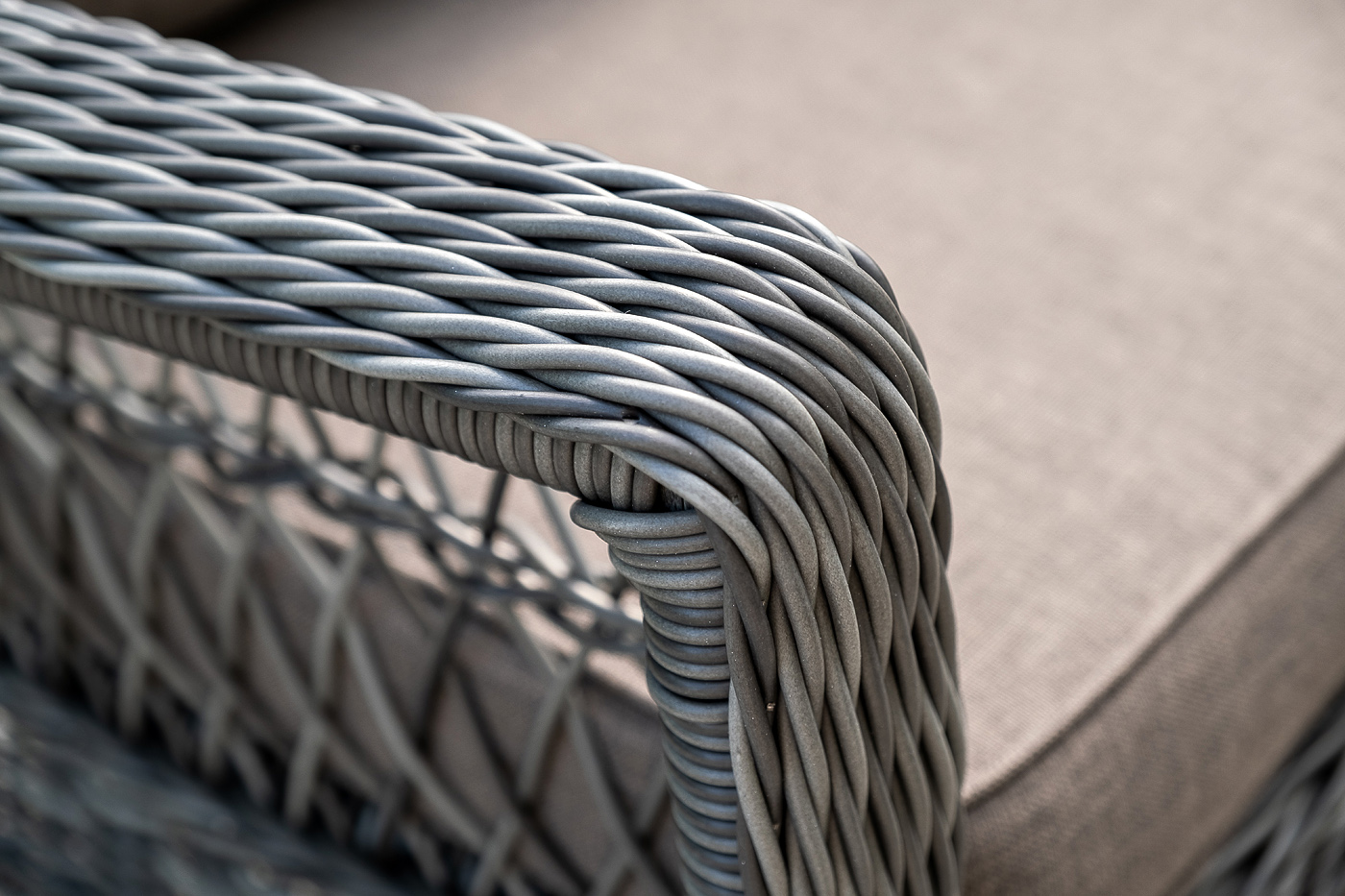 Уличная мебель имеет алюминиевый каркас с ручным плетением из искусственного ротанга в цвете "графит". Предусмотрены мягкие подушки из полиэстера серо-коричневого цвета с плотностью 230гр/м2. Они имеет влагоотталкивающую пропитку. Рабочая поверхность столика изготовлена из закаленного стекла толщиной 5 мм.