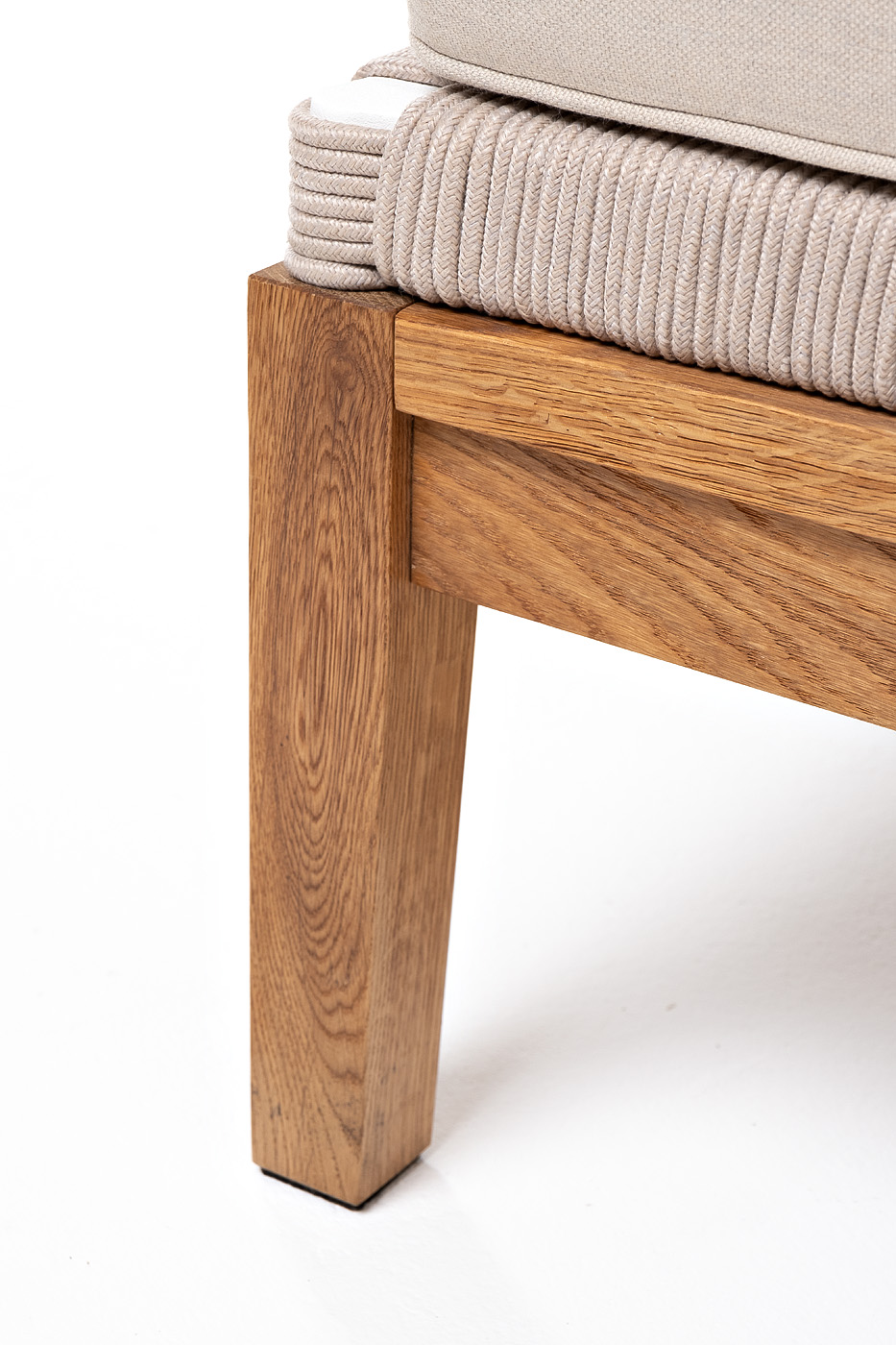Боковины каркаса вручную оплетены роупом - эластичными синтетическими лентами, изготовленными из высокопрочных полиэфирных волокон. Цвет оплетки - бежевый. Основание дуб.