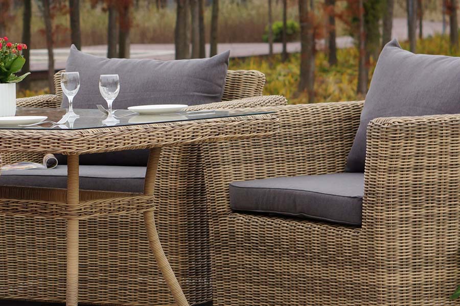 Мебель изготовлена из легкого, но прочного алюминия, оплетенного долговечным искусственным ротангом природного соломенного оттенка. На диване и креслах предусмотрены подушки с чехлами из полиэстера серо-коричневого цвета. Съёмные чехлы пропитаны специальными влагоотталкивающими средствами, которые способы защитить от намокания.