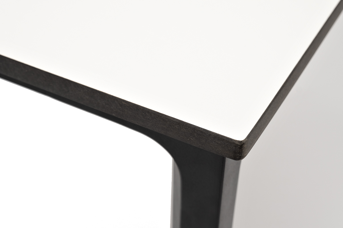 Столешница выполнена из современного высококачественного монолитного компакт-пластик HPL, толщиной 12 мм в молочном цветом. Материал устойчив к высоким температурам, попаданию влаги и может использоваться при любых погодных условиях. Подстолье изготовлено из крашеного алюминия черного цвета.